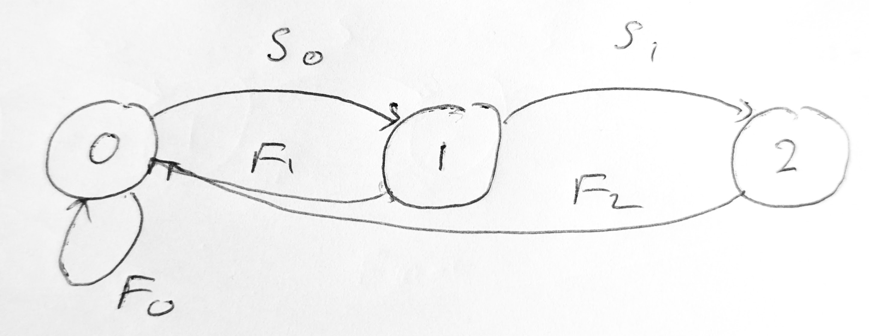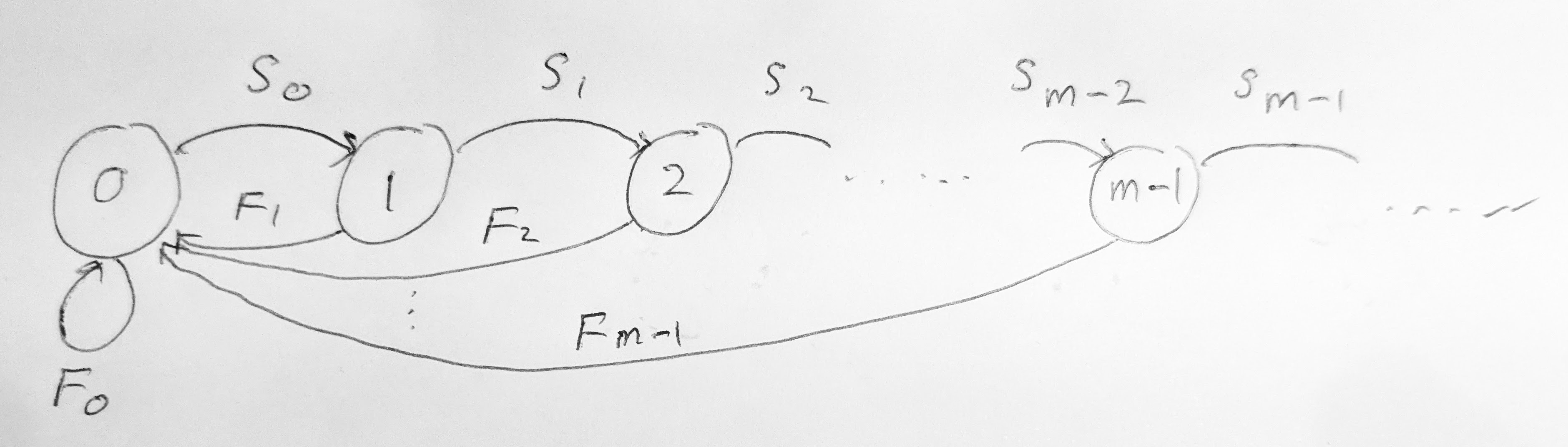 We can represent this Leslie matrix with the directed graph in Figure 5.1. The graph has one node for each age class \(a=0,1,2,\ldots,m-1\) and a directed edge from node \(i\) to node \(j\) if and only if the Leslie matrix has a non-zero entry in column \(i\) and row \(j\). The graph is called the Leslie graph.