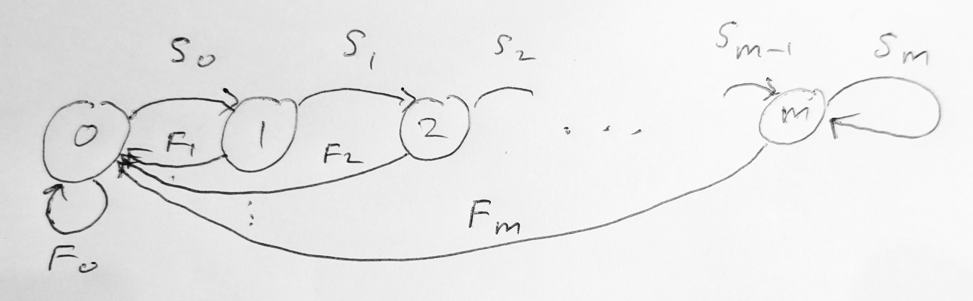 The other situation where we only need a finite number of age classes is where the survival probabilities and the reproduction numbers are constant for all ages above a certain age \(m-1\). We can then collapse all individuals of age \(m\) or larger into the same age class \(m\). The survivors from age class \(m\) are thus put back into the same age class \(m\). This modifies the equation for \(N_{m,t+1}\) to \[ N_{m,t+1} = S_{m-1} N_{m-1,t} + S_{m} N_{m,t}. \tag{5.11}\] In this case we can write the model as a matrix equation of the form \[ \begin{pmatrix} N_{0} \\ N_{1} \\ N_{2} \\ \vdots \\ N_{m} \end{pmatrix}_{t+1} = \begin{pmatrix} F_0 & F_1 & \cdots & F_{m-1} & F_{m} \\ S_0 & 0 & \cdots & 0 & 0 \\ 0 & S_1 & \cdots & 0 & 0 \\ \vdots & \vdots & \ddots & \vdots & \vdots \\ 0 & 0 & \cdots & S_{m-1} & S_m \end{pmatrix} \begin{pmatrix} N_{0} \\ N_{1} \\ N_{2} \\ \vdots \\ N_{m} \end{pmatrix}_{t}. \tag{5.12}\] Now \(N_{m,t}\) is the number of all individuals of age \(m\) or older at time \(t\). We can represent this Leslie matrix with the graph in Figure 5.2 .