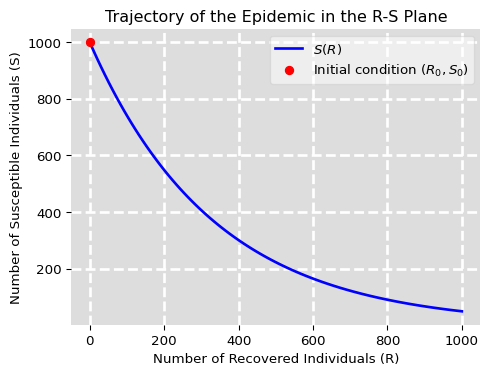 def S(R, S0, N, beta, gamma):return S0 * np.exp(-beta / gamma * R / N)# R valuesRv = np.linspace(1, N, 100)# Compute S(R)Sv = S(Rv, S0, N, beta, gamma)# Plot setup with style similar to the SIR model plotplt.figure(figsize=(5.5, 4), facecolor='w')ax = plt.subplot(111, facecolor='#dddddd')# Plotting S(R) and initial conditionsax.plot(Rv, Sv, 'b-', lw=2, label='$S(R)$')ax.plot(R0, S0, 'ro', label='Initial condition $(R_0, S_0)$')# Adding grid, labels, title, and legendax.set_xlabel('Number of Recovered Individuals (R)')ax.set_ylabel('Number of Susceptible Individuals (S)')ax.set_title('Trajectory of the Epidemic in the R-S Plane')ax.grid(True, which='major', c='w', lw=2, ls='--')legend = ax.legend(loc='upper right')legend.get_frame().set_alpha(0.5)# Adjusting spines to match the SIR model plot stylefor spine in ('top', 'right', 'bottom', 'left'): ax.spines[spine].set_visible(False)