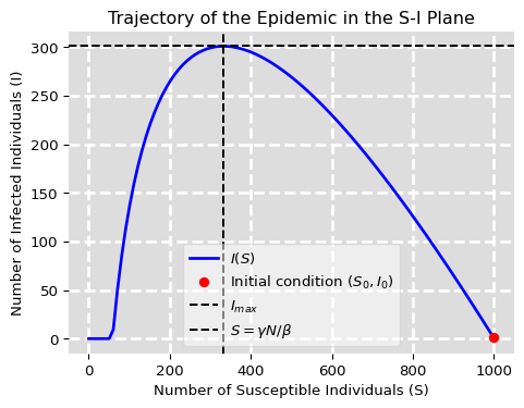 def I(S, S0, N, beta, gamma):return N - S + gamma * N / beta * np.log(S / S0)# S valuesSv = np.linspace(1, N, 100)# Compute I(S)Iv = I(Sv, S0, N, beta, gamma)Iv[Iv <0] =0# Ensure I(S) is non-negativeS_threshold = gamma / beta * NImax = I(S_threshold, S0, N, beta, gamma)# Plot setup with style similar to the SIR model plotplt.figure(figsize=(5.5, 4), facecolor='w')ax = plt.subplot(111, facecolor='#dddddd')# Plotting I(S) and initial conditionsax.plot(Sv, Iv, 'b-', lw=2, label='$I(S)$')ax.plot(S0, I0, 'ro', label='Initial condition $(S_0, I_0)$')# Adding horizontal and vertical lines for Imax and S=gamma N/betaax.axhline(y=Imax, color='k', linestyle='--', lw=1.5, label=r'$I_{max}$')ax.axvline(x=S_threshold, color='k', linestyle='--', lw=1.5, label=r'$S=\gamma N/\beta$')# Adding grid, labels, title, and legendax.set_xlabel('Number of Susceptible Individuals (S)')ax.set_ylabel('Number of Infected Individuals (I)')ax.set_title('Trajectory of the Epidemic in the S-I Plane')ax.grid(True, which='major', c='w', lw=2, ls='--')legend = ax.legend(loc='lower center')legend.get_frame().set_alpha(0.5)# Adjusting spines to match the SIR model plot stylefor spine in ('top', 'right', 'bottom', 'left'): ax.spines[spine].set_visible(False)