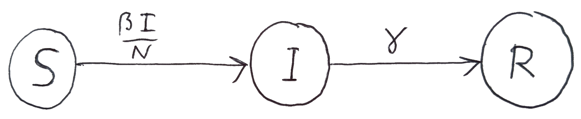 We can represent the SIR model graphically by a directed graph with one node for each compartment and directed edges between the nodes to represent the flow of individuals between the compartments. This is illustrated in Figure 6.2. We have labelled the edges by the per-capita rates.