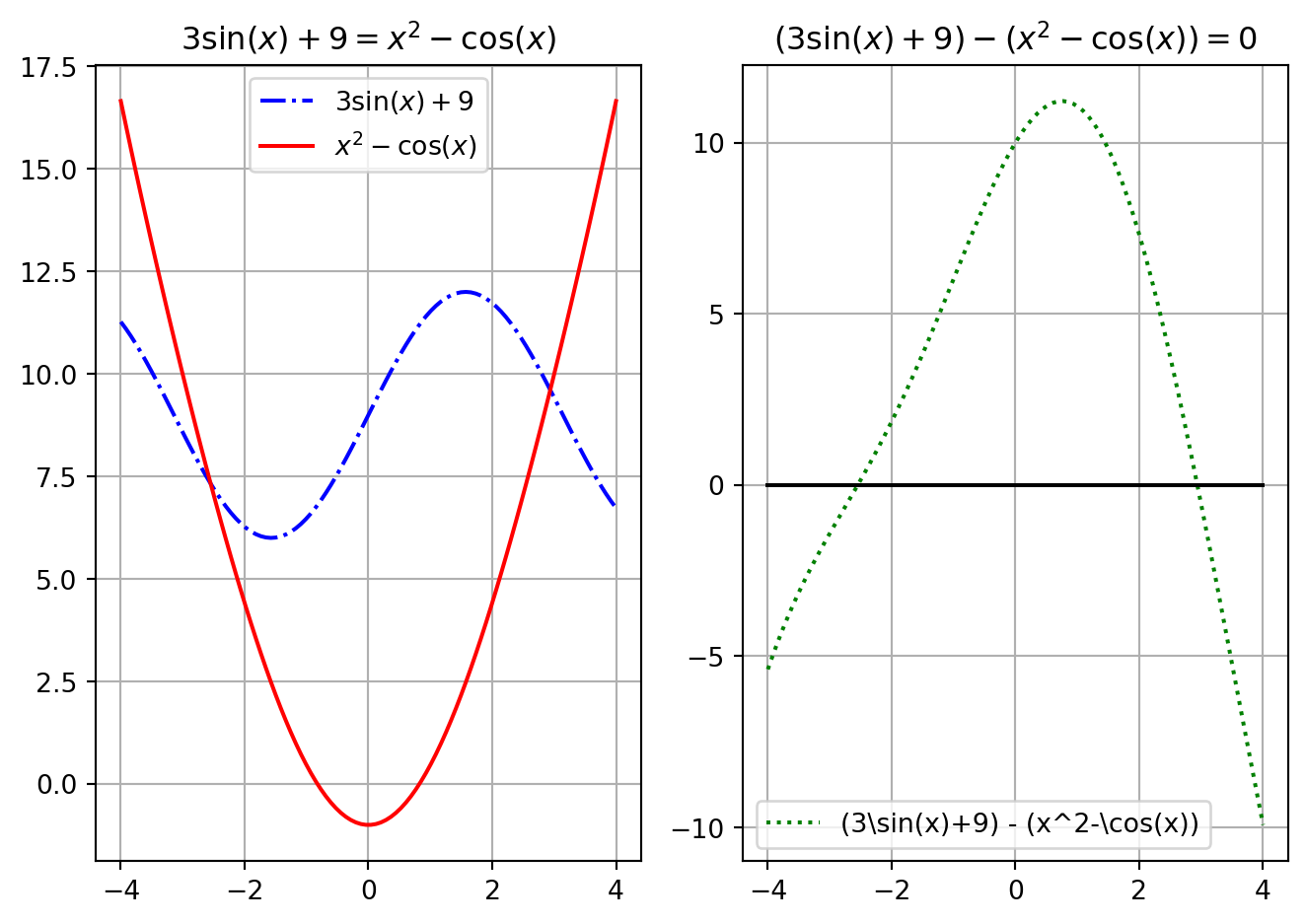 axes[1].set_title(r"$(3\sin(x)+9) - (x^2-\cos(x))=0$")