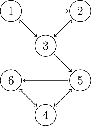 As an example we will consider node 3 in Figure C.3. There are three out links from node 3 (to nodes 1, 2, and 5). Hence \(H_{13}=1/3\), \(H_{23} = 1/3\), and \(H_{53} = 1/3\) and the partially complete hyperlink matrix is \[\begin{equation} H = \begin{pmatrix} - & - & 1/3 & - & - & - \\ - & - & 1/3 & - & - & - \\ - & - & 0 & - & - & - \\ - & - & 0 & - & - & - \\ - & - & 1/3 & - & - & - \\ - & - & 0 & - & - & - \end{pmatrix} \end{equation}\]The difference equation \(\boldsymbol{x}_{n+1} = H \boldsymbol{x}_n\) is used to iteratively refine the estimates of the page ranks. You can view the iterations as a person visiting a page and then following a link at random, then following a random link on the next page, and the next, and the next, etc. Hence we see that the iterations evolve exactly as expected for a difference equation.