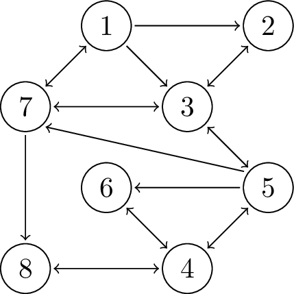 Exercise C.99 One thing that we did not consider in this version of the Google Page Rank algorithm is the random behaviour of humans. One, admittedly slightly naive, modification that we can make to the present algorithm is to assume that the person surfing the web will randomly jump to any other page in the web at any time. For example, if someone is on page 1 in Figure C.4 then they could randomly jump to any page 2 - 8. They also have links to pages 2, 3, and 7. That is a total of 10 possible next steps for the web surfer. There is a \(2/10\) chance of heading to page 2. One of those is following the link from page 1 to page 2 and the other is a random jump to page 2 without following the link. Similarly, there is a \(2/10\) chance of heading to page 3, \(2/10\) chance of heading to page 7, and a \(1/10\) chance of randomly heading to any other page.
