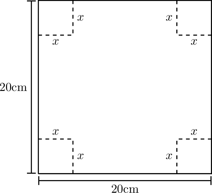 A piece of cardboard measuring 20cm by 20cm is to be cut so that it can be folded into a box without a lid (see Figure 6.1). We want to find the size of the cut, \(x\), that maximises the volume of the box.