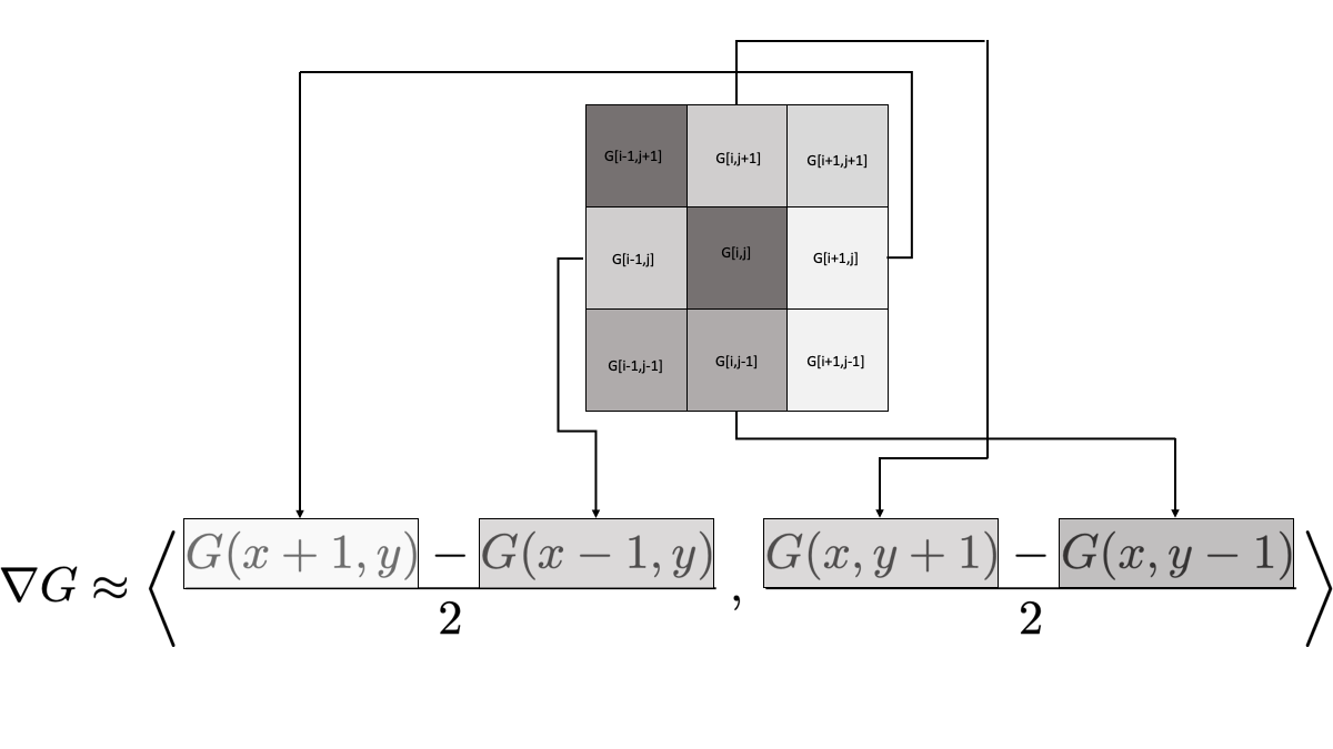 G[i,j]is the pixel at which we want to evaluate the gradient, and the surrounding pixels are labelled by their indices relative to[i,j].