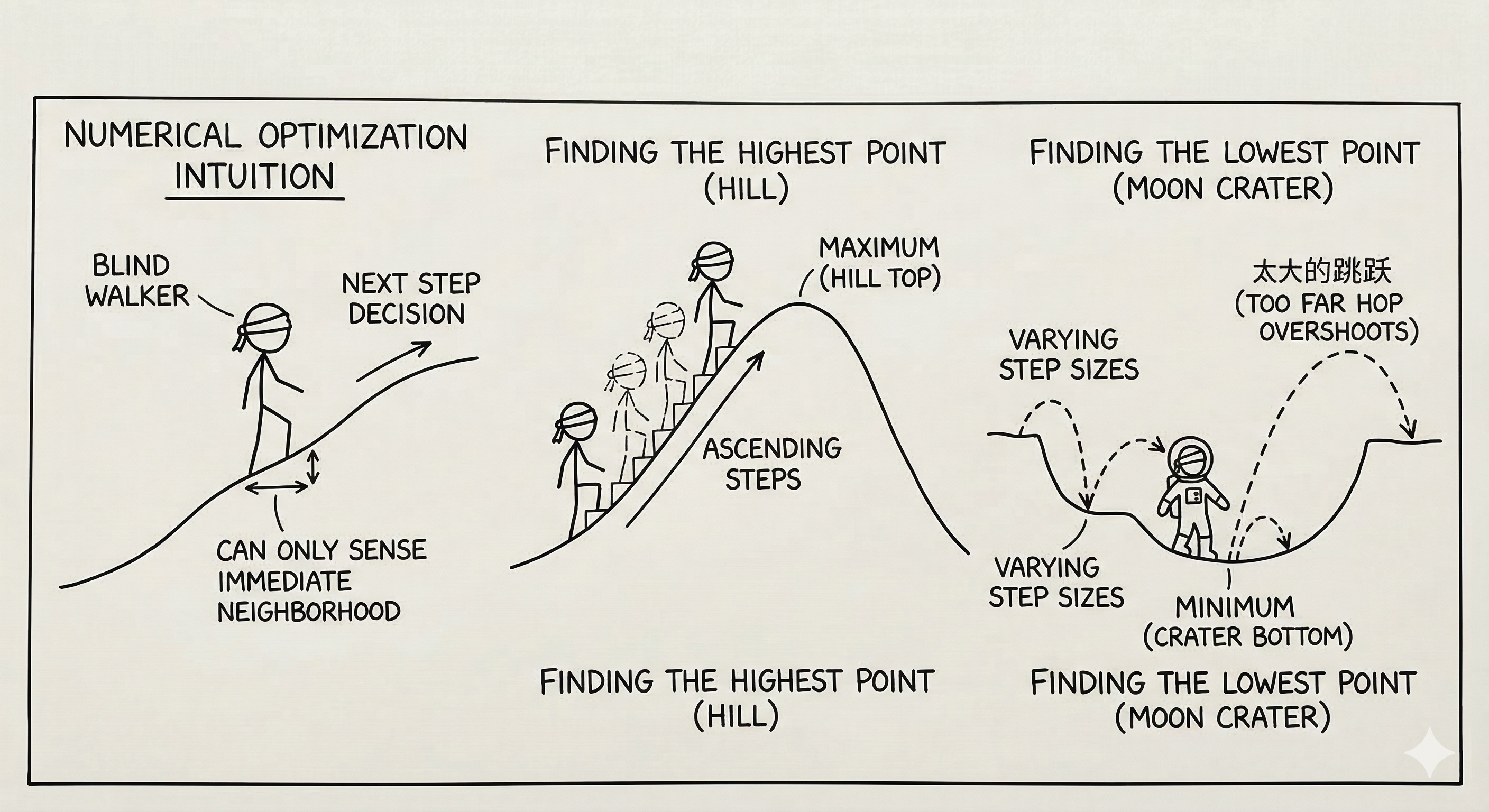 The intuition behind more efficient numerical optimisation schemes is typically to visualize the function as representing a landscape on which you are trying to walk or jump to the highest or lowest point. You however can only sense your immediate neighbourhood and need to use that information to make decisions about where to jump or walk to next.