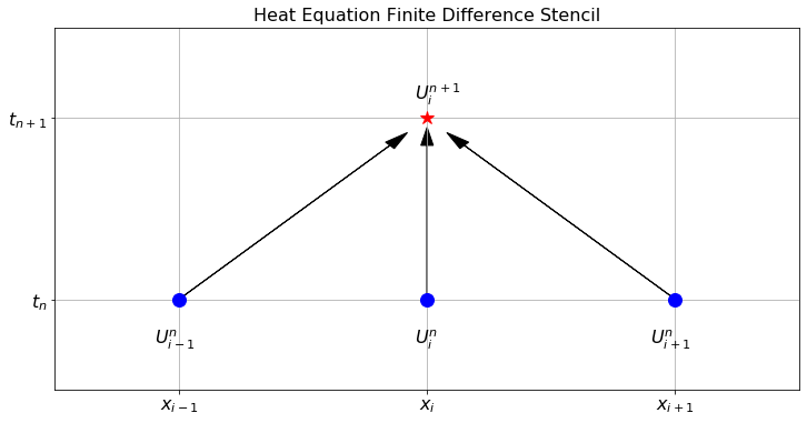 There are many different finite difference schemes due to the fact that there are many different ways to approximate derivatives (See Chapter 5.2). One convenient way to keep track of which information you are using and what you are calculating in a finite difference scheme is to use a finite difference stencil image. Figure 9.1 shows the finite difference stencil for the approximation to the heat equation that you built in the previous exercise. In this figure we are showing that the function values \(U_{i-1}^n\), \(U_i^n\), and \(U_{i+1}^n\) at the points \(x_{i-1}\), \(x_i\), and \(x_{i+1}\) at time step \(t_n\) are used to calculate \(U_i^{n+1}\). We will build similar stencil diagrams for other finite difference schemes throughout this chapter.