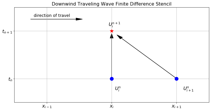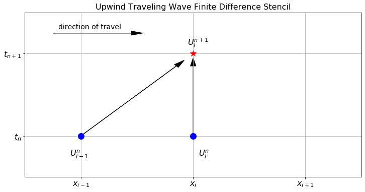 Figure E.2 shows the finite difference stencil for the upwind scheme. We call this scheme “up” since we expect the wave to travel from left to right and we can think of a fictitious wind blowing the solution from left to right. Notice that we are using information from “upwind” of the point at the new time step.