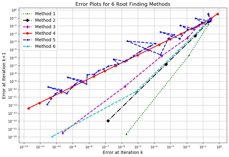 Exercise 4.28 In Figure 4.6 you see six different log-log plots of the new error to the old error for different root finding techniques. What is the order of the approximate convergence rate for each of these methods?