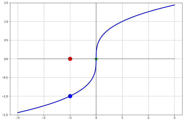 Now let us look at the Newton iteration in a bit more detail. Since \(f(x) = x^{1/3}\) and \(f'(x) = \frac{1}{3} x^{-2/3}\) the Newton iteration can be simplified as \[ x_{n+1} = x_n - \frac{x_n^{1/3}}{ \left( \frac{1}{3} x_n^{-2/3} \right)} = x_n - 3 \frac{x_n^{1/3}}{x_n^{-2/3}} = x_n - 3x_n = -2x_n. \] What does this tell us about the Newton iterations?