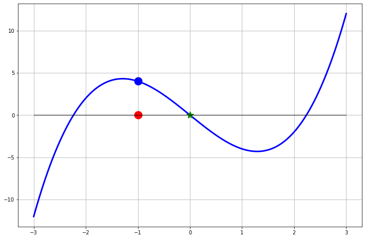 Exercise 4.11 🖋 Repeat the previous exercise with the function \(f(x) = x^3 - 5x\) with the starting point \(x_0 = -1\). Again this is easy to do with pen and paper.