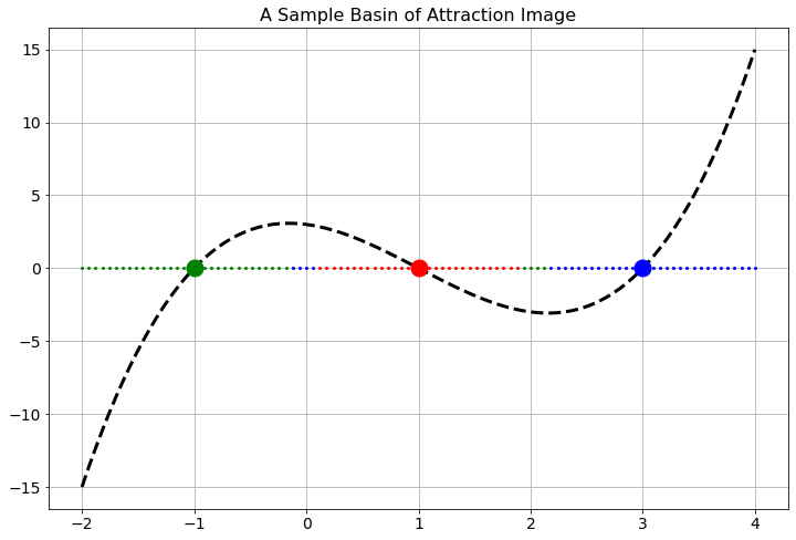 Let \(f(x)\) be a differentiable function with several roots. Given a starting \(x\) value we should be able to apply Newton’s Method to that starting point and we will converge to one of the roots (so long as you are not in one of the special cases discussed earlier in the chapter). It stands to reason that starting points near each other should all end up at the same root, and for some functions this is true. However, it is not true in general.