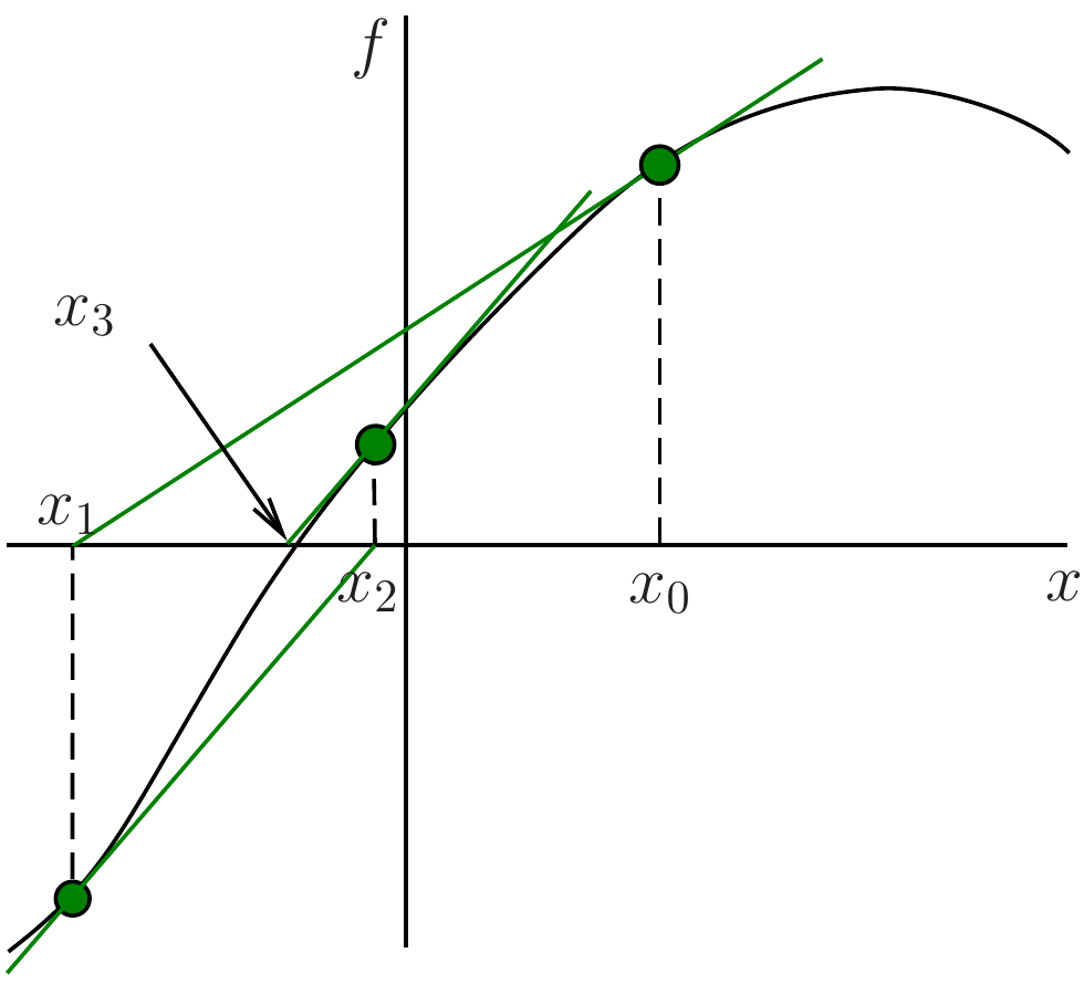 The graphical method illustrated in Figure 4.1 was introduced by Sir Isaac Newton and is therefore known as Newton’s Method. Joseph Raphson then gave the algebraic formulation and popularised the method, which is therefore also known as the Newton-Raphson method.