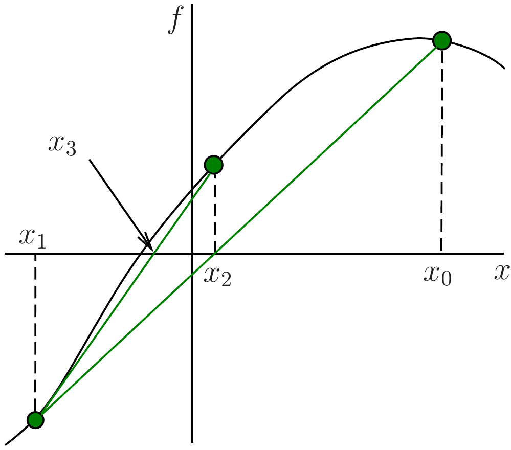 Exercise 4.19 🖋 Notice that the iteration formula for \(x_{n+1}\) that you derived depends on both \(x_n\) and \(x_{n-1}\). So to start the iteration you need to choose two points \(x_0\) and \(x_1\) before you can calculate \(x_2, x_3, \dots\). Draw several pictures showing what the secant method does pictorially. Discuss whether it is important to choose these starting points close to the root and close to each other.