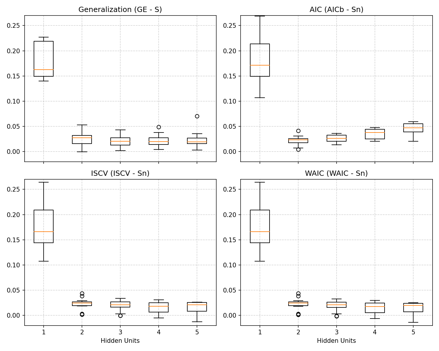titles = ['Generalization (GE - S)', 'AIC (AICb - Sn)', 'ISCV (ISCV - Sn)', 'WAIC (WAIC - Sn)']