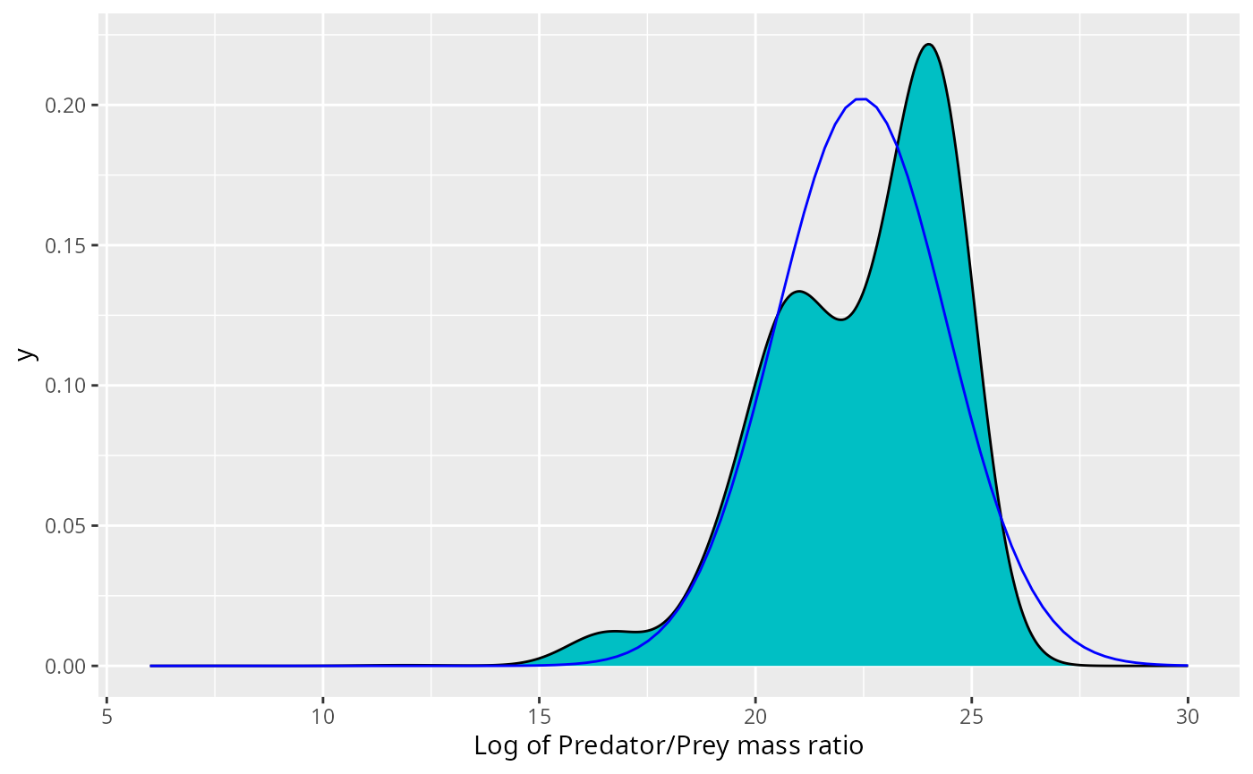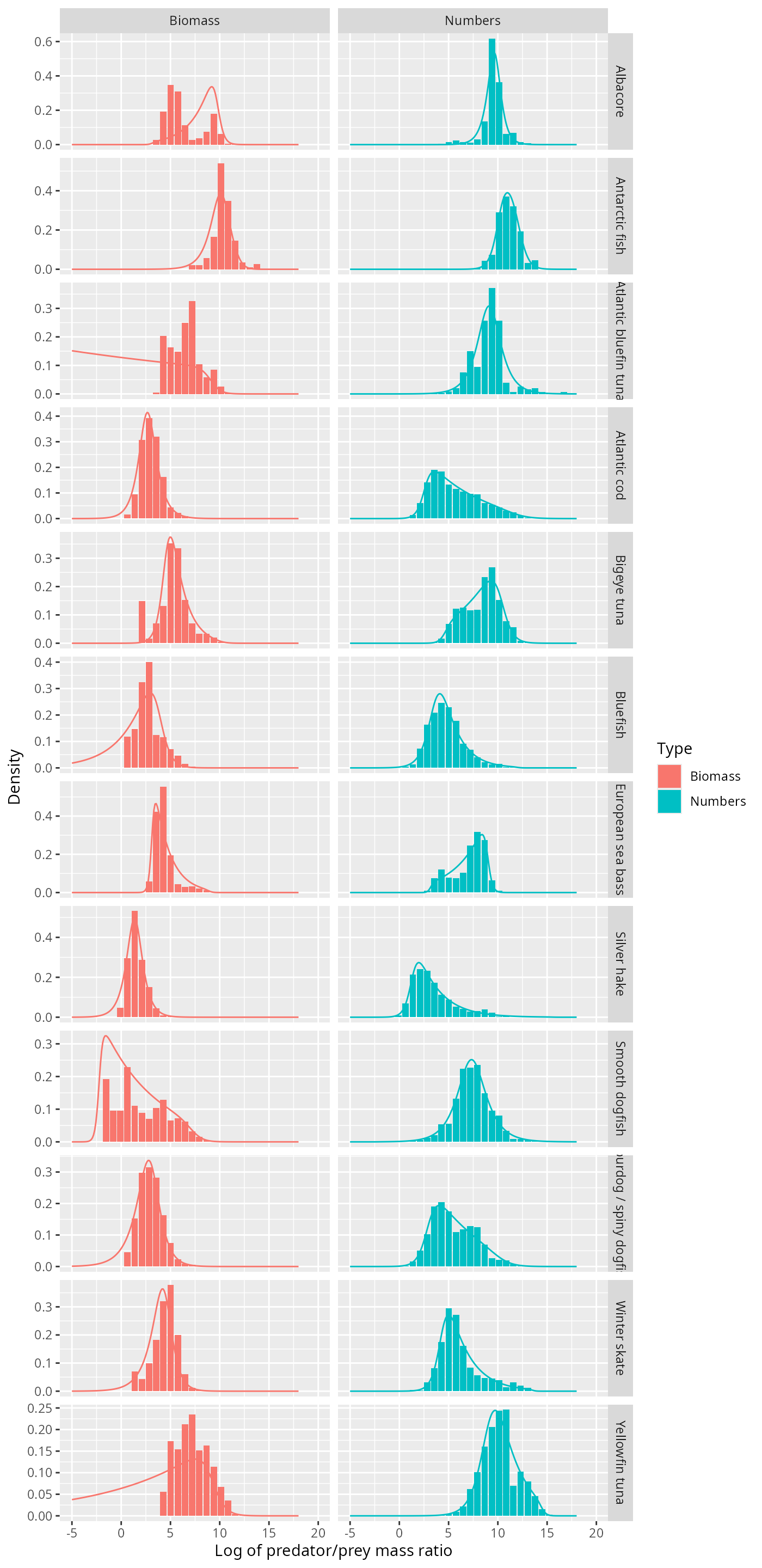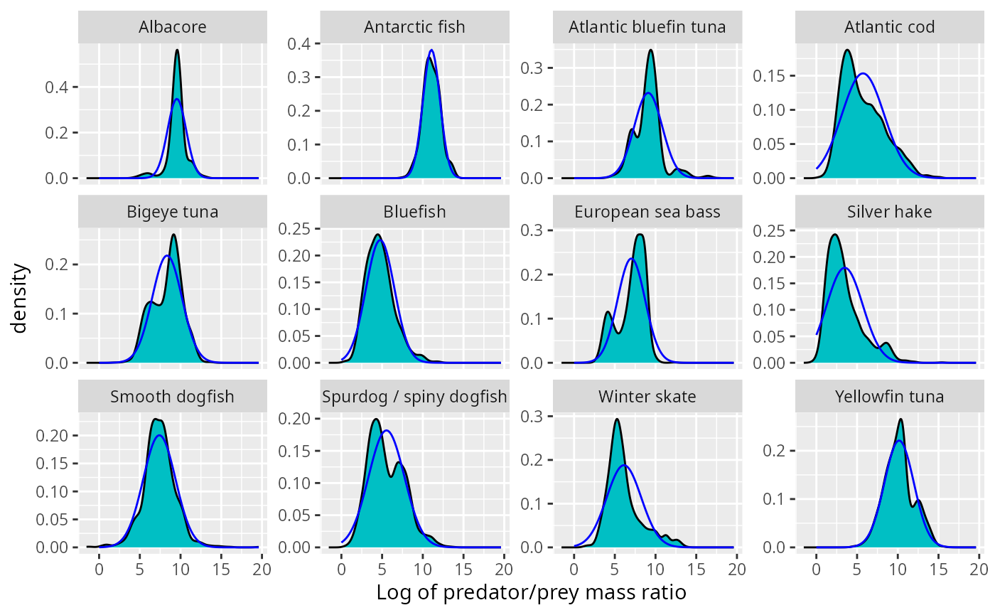 We have here used all observations for a predator species, independently of the geographic origin of the observation. It is quite likely that the diet is different in different geographic locations, for example because the distribution of prey will be different. Perhaps if we had allowed a mixture of normal distributions, this would have given better fits.