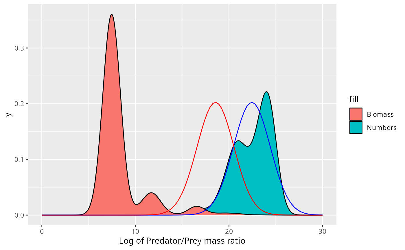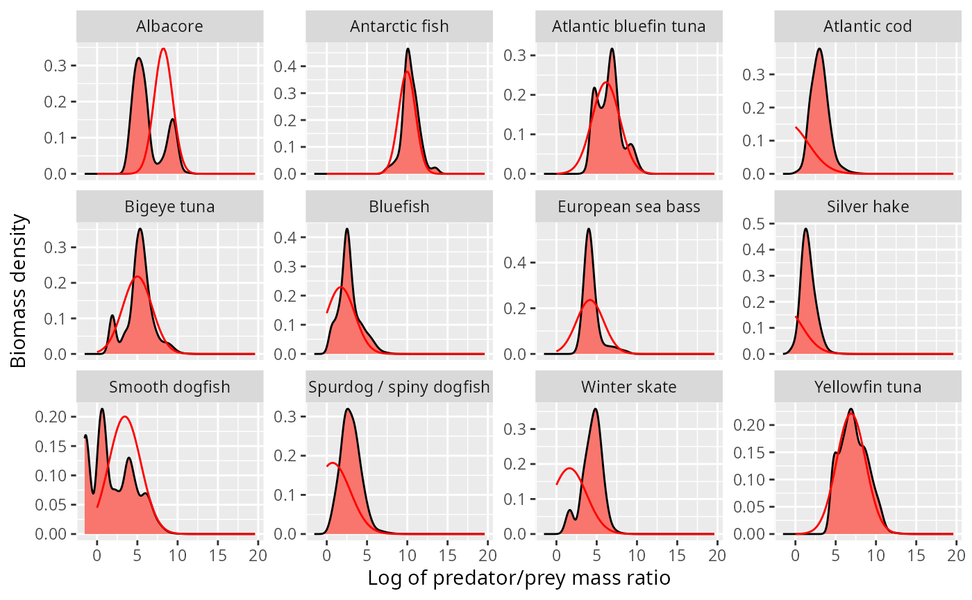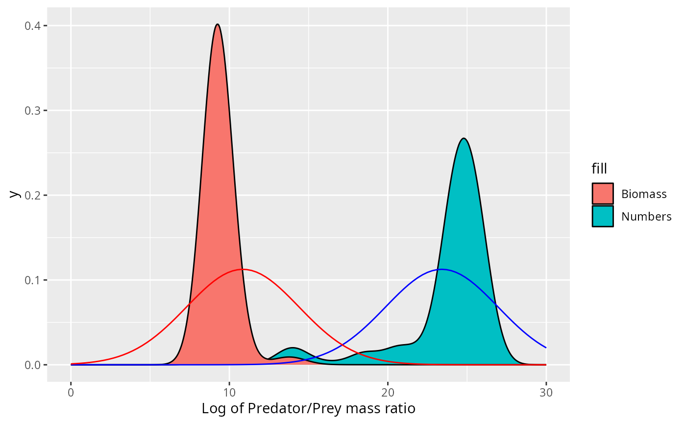 We have here used all observations for a predator species, independently of the geographic origin of the observation. It is quite likely that the diet is different in different geographic locations, for example because the distribution of prey will be different. Perhaps if we had allowed a mixture of normal distributions, this would have given better fits.
