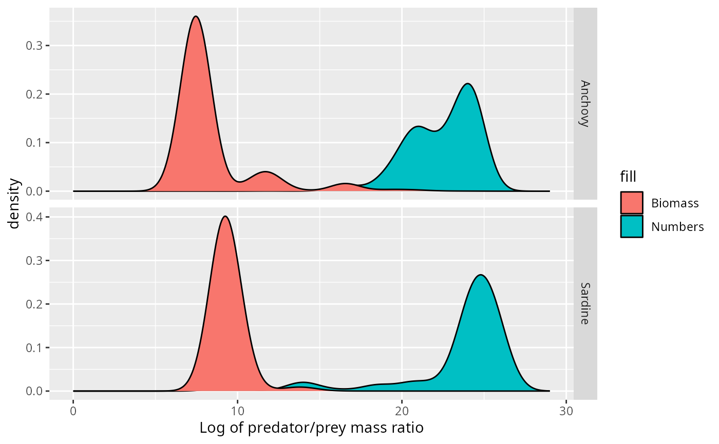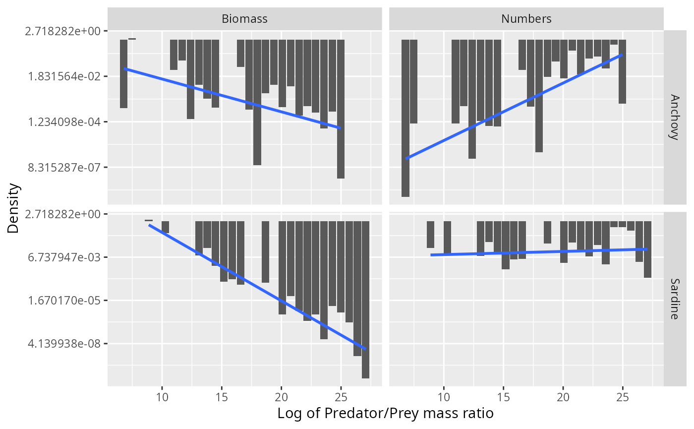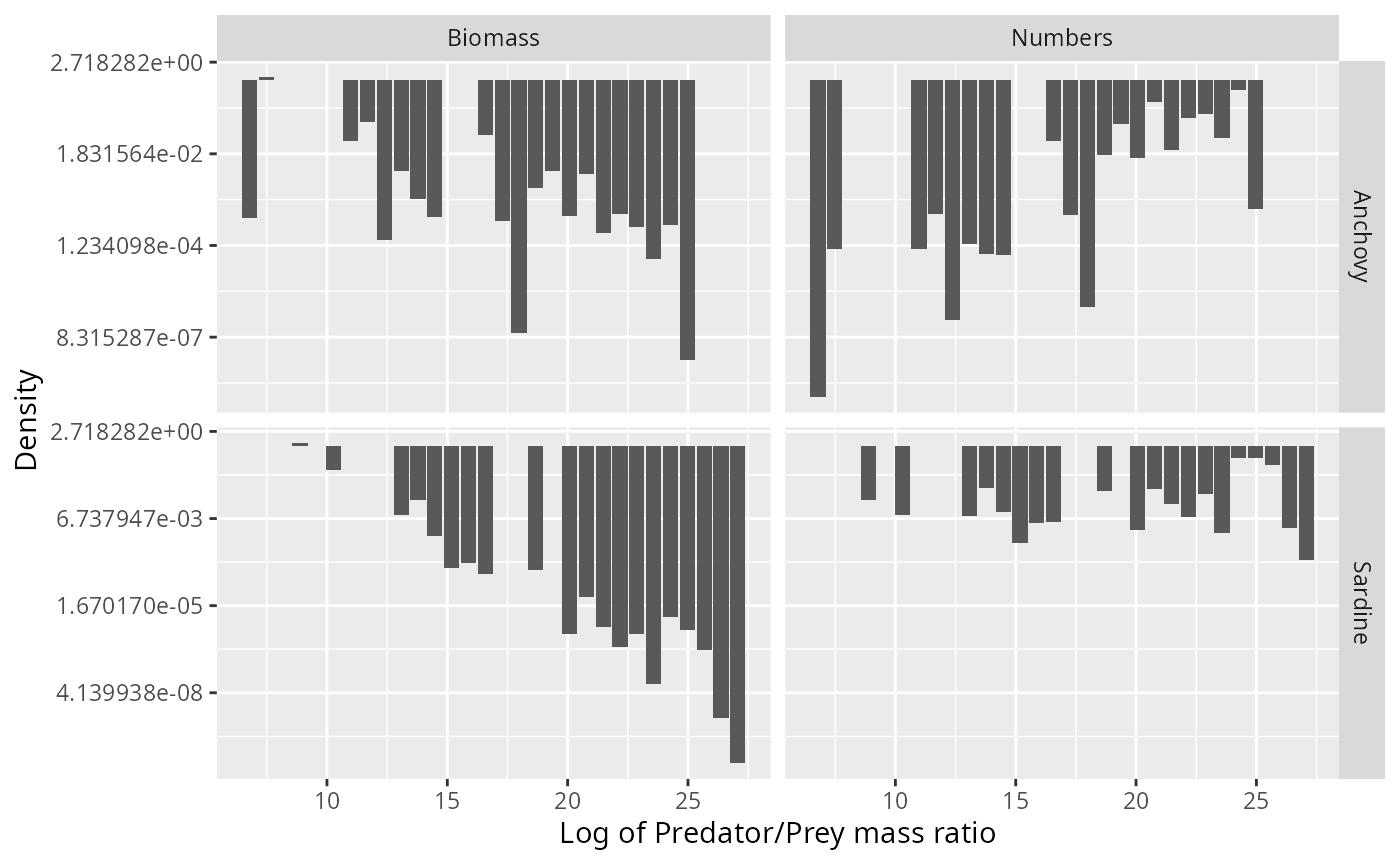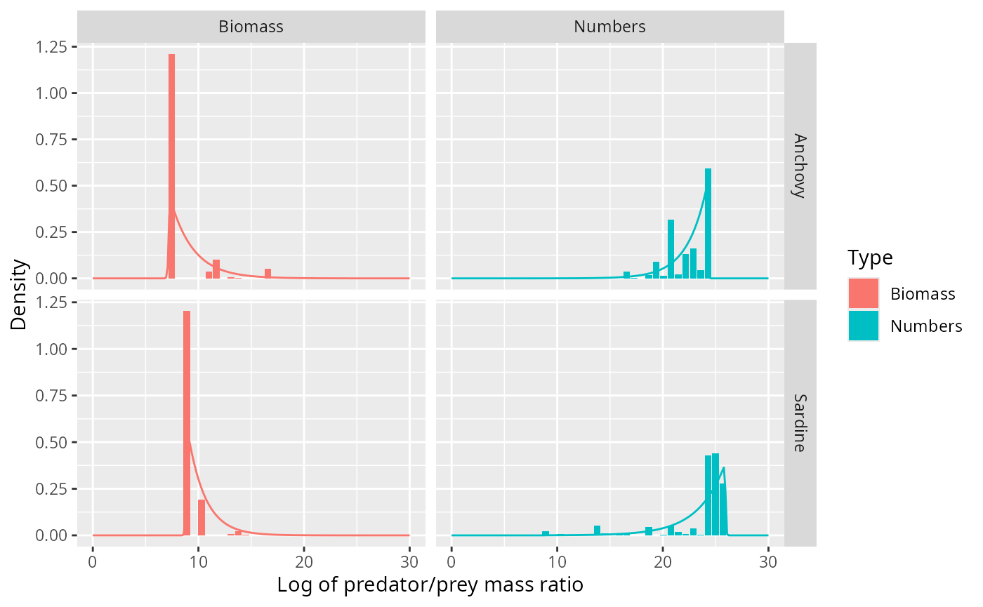 We want to use summarise observations of the stomach content data by fitting distributions to the observed predator/prey mass ratio. This can then later be used to derive appropriate expressions for the predation kernel in size-spectrum models.