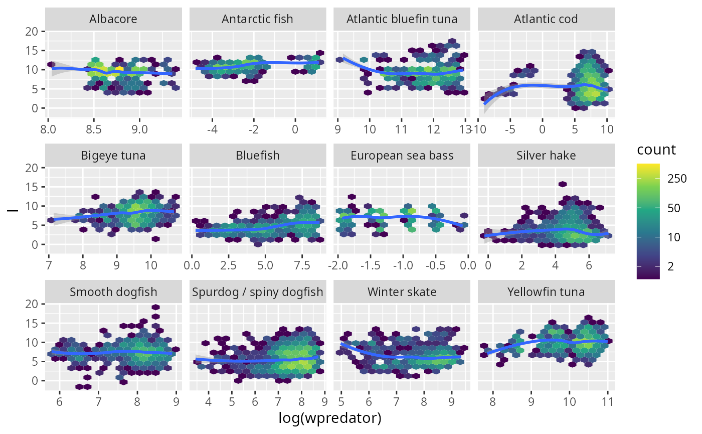 In this analysis we will completely ignore the species identity of the prey, looking only at the size of the prey. For each predator species we also amalgamate all observations in the data sets and do not disaggregate by other variables like place or time. Before we believe anything derived here, the influence of such other factors should be investigated. This is only meant to be a start. More reliable results could perhaps be obtained using mixed effects models.