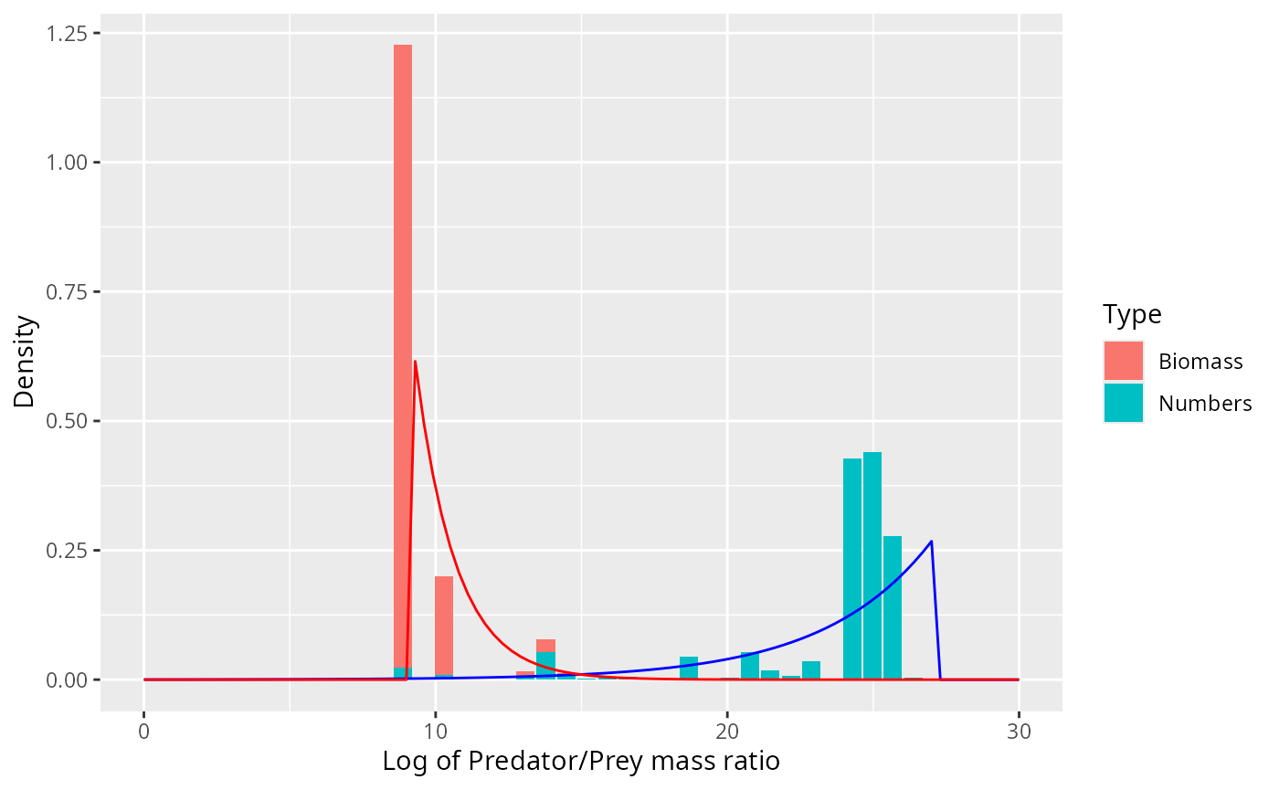 A crucial observation that we are going to make is that when fitting distributions one should consider both the number distributions and the biomass distributions. Even if we have a good fit for the number distribution the resulting fit for the biomass distribution may be very wrong.